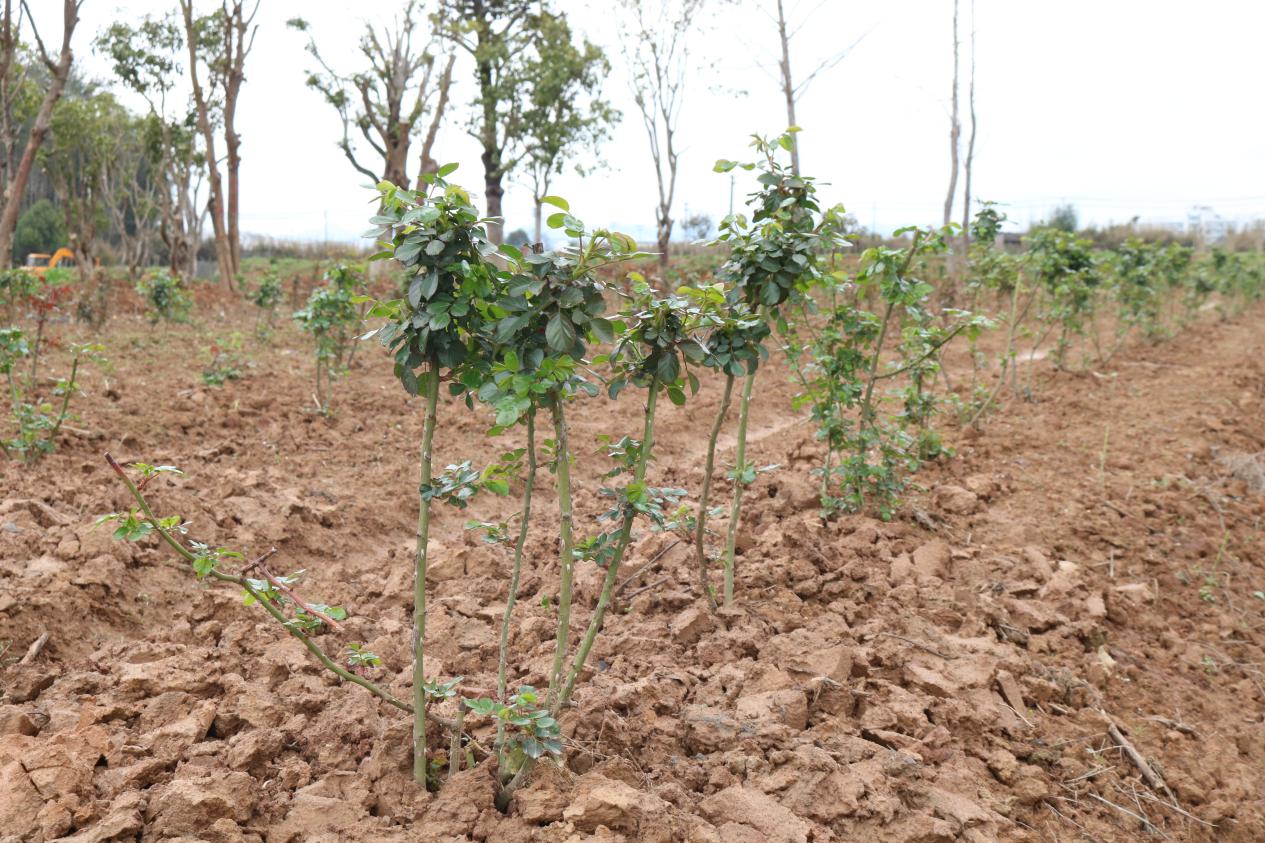 在月季扦插大棚內(nèi),工作人員正在揮舞鋤頭進行松土,前期扦插的一株株月季已經(jīng)抽出了新芽,安吉拉、大游行等品種的月季長勢喜人;藤本月季花墻前,工作人員正在對月季的生長情況進行記錄,檢查月季是否存在病蟲害;種植地上,挖掘機正在對場地進行平整,為苗圃擴大種植規(guī)模做好準備。