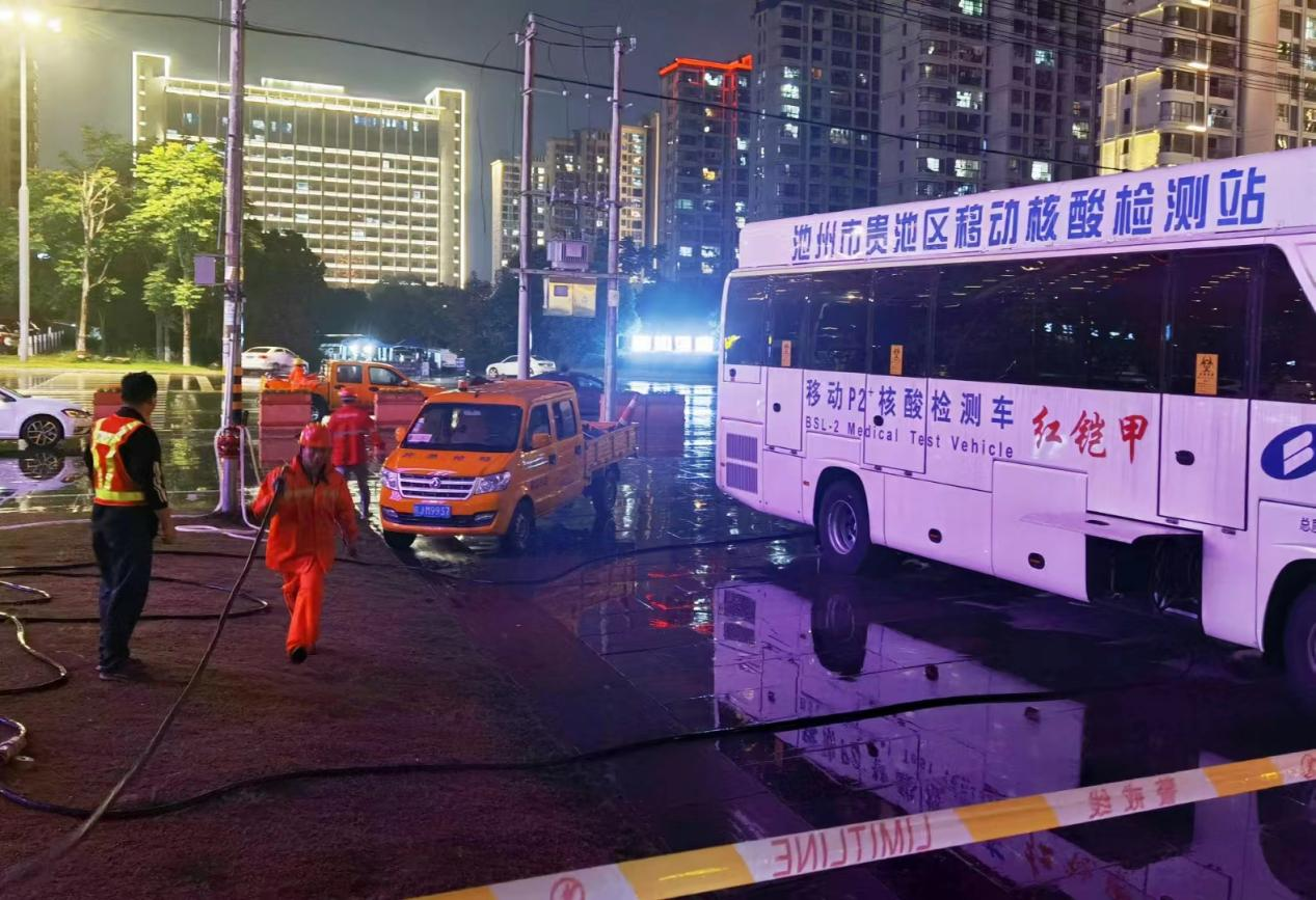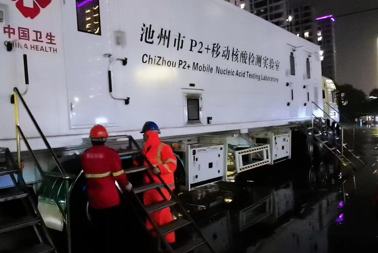 5月14號上午11點接到疫情防控指揮部要求協(xié)助保障池州馳援黃山移動式核酸檢測實驗室順利開展檢測的任務(wù),公司立即啟動防控預(yù)案,快速集結(jié)專業(yè)應(yīng)急志愿隊伍,于11點30分8名應(yīng)急志愿者到底人民廣場開始搭設(shè)保障設(shè)施,共鋪設(shè)35平方電纜200米,自來水管50米。晚上6點池州檢測車到達人民廣場,應(yīng)急志愿隊伍立即冒雨開展檢測車搭建工作及接電工作,搬運檢測物資20件,于晚上10點完成整體搭建工作,有利地保障了檢測工作的順利開展。