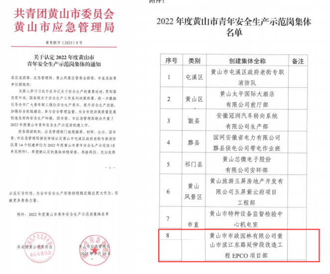 日前,共青團(tuán)黃山市委、應(yīng)急管理局聯(lián)合組織開展的“2022年度黃山市青年安全生產(chǎn)示范崗”評(píng)選結(jié)果揭曉,市政園林公司黃山市濱江東路延伸段改造工程EPCO項(xiàng)目部以?shī)^發(fā)有為的青春風(fēng)貌、卓越突出的工作業(yè)績(jī)、扎實(shí)有效的創(chuàng)建活動(dòng),成功脫穎而出獲此殊榮。