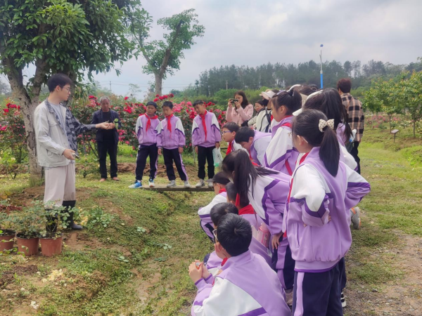 為了讓同學們能對基地內(nèi)花卉苗木有更全面的認知,苗圃基地專門為研學隊伍安排講解員,帶領同學們一起走進自然課堂。進入花卉區(qū),品種繁多、顏色各異,形態(tài)不一的月季首先映入眼簾,瞬間吸引同學們駐足觀賞,在講解員的科普下,同學們認真聆聽,了解月季的形態(tài)特征、品種、生長條件等知識,并積極參與月季小知識問答環(huán)節(jié)。隨后講解員帶領同學們參觀了灌木區(qū)、灌溉區(qū)、景觀區(qū)等區(qū)域,并對每個區(qū)域的功能特點進行了一一介紹。參觀環(huán)節(jié)結(jié)束后,講解員對如何進行月季扦插進行了講解示范,同學們興趣高昂,爭先恐后地親身體驗了月季扦插的全過程。