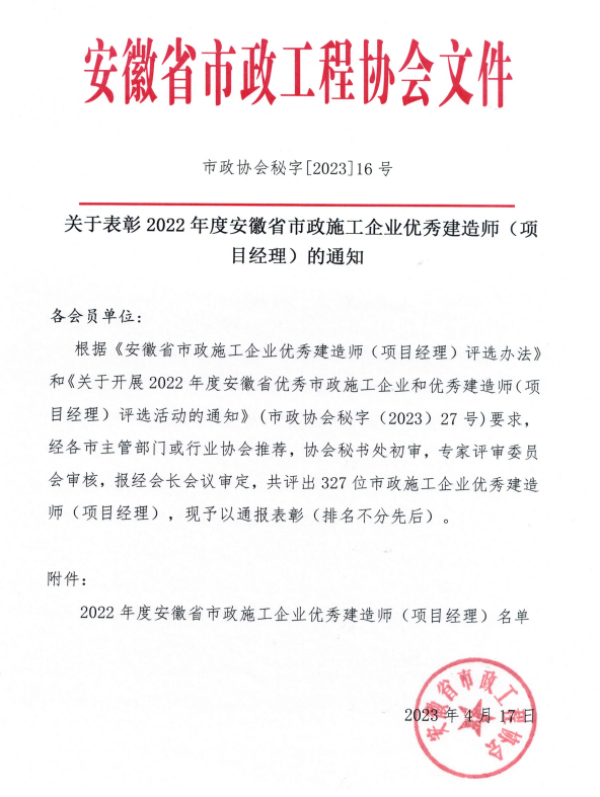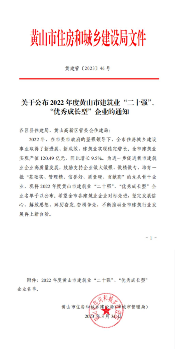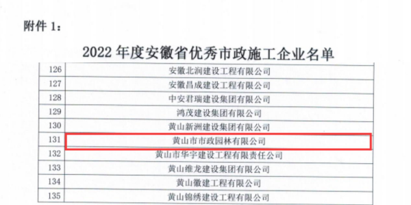 近日,市政園林公司榮膺2022年度安徽省優(yōu)秀市政施工企業(yè),2022年度黃山市建筑業(yè)“優(yōu)秀成長(zhǎng)型”企業(yè),兩名項(xiàng)目經(jīng)理獲評(píng)2022年度安徽省市政施工企業(yè)優(yōu)秀建造師。