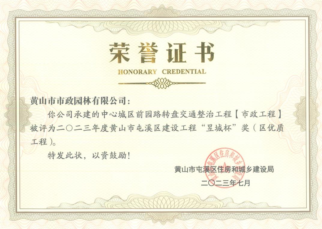 近日,屯溪區(qū)住建局公布了2023年度屯溪區(qū)建設(shè)工程“昱城杯”(區(qū)優(yōu)質(zhì)工程)表彰名單,市政園林公司承建的中心城區(qū)前園路轉(zhuǎn)盤交通整治工程和戴震公園環(huán)珠塘亮化等提升改造采購項(xiàng)目獲評區(qū)優(yōu)質(zhì)工程。