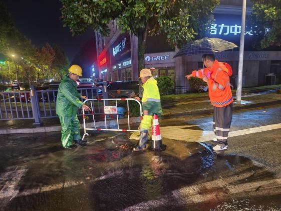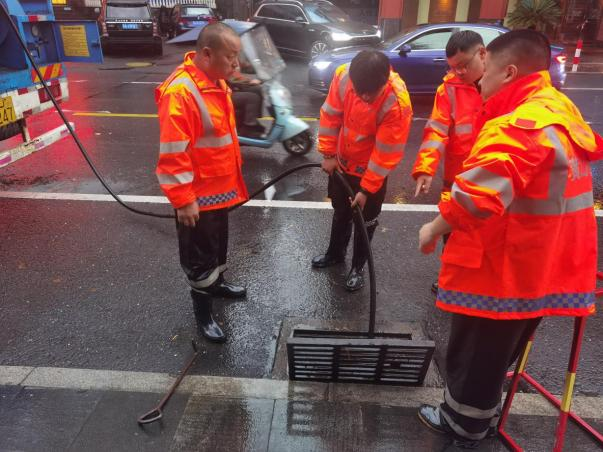 搶險現(xiàn)場,“高壓沖洗車+人工清掏”組合模式顯實效。針對15處嚴重堵塞點,高壓水槍精準沖擊管道淤積物,配合人工清理落葉雜物,排水效率提升40%。針對打開的25處雨水箅,搶險隊創(chuàng)新設置“雙層防護欄+反光警示牌+防爆警示燈”三重防護,并增派15名隊員配合交警實施交通管制,保障市民通行安全。